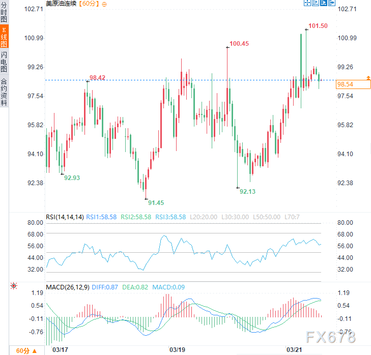 (美原油连续小时图,来源:易汇通)