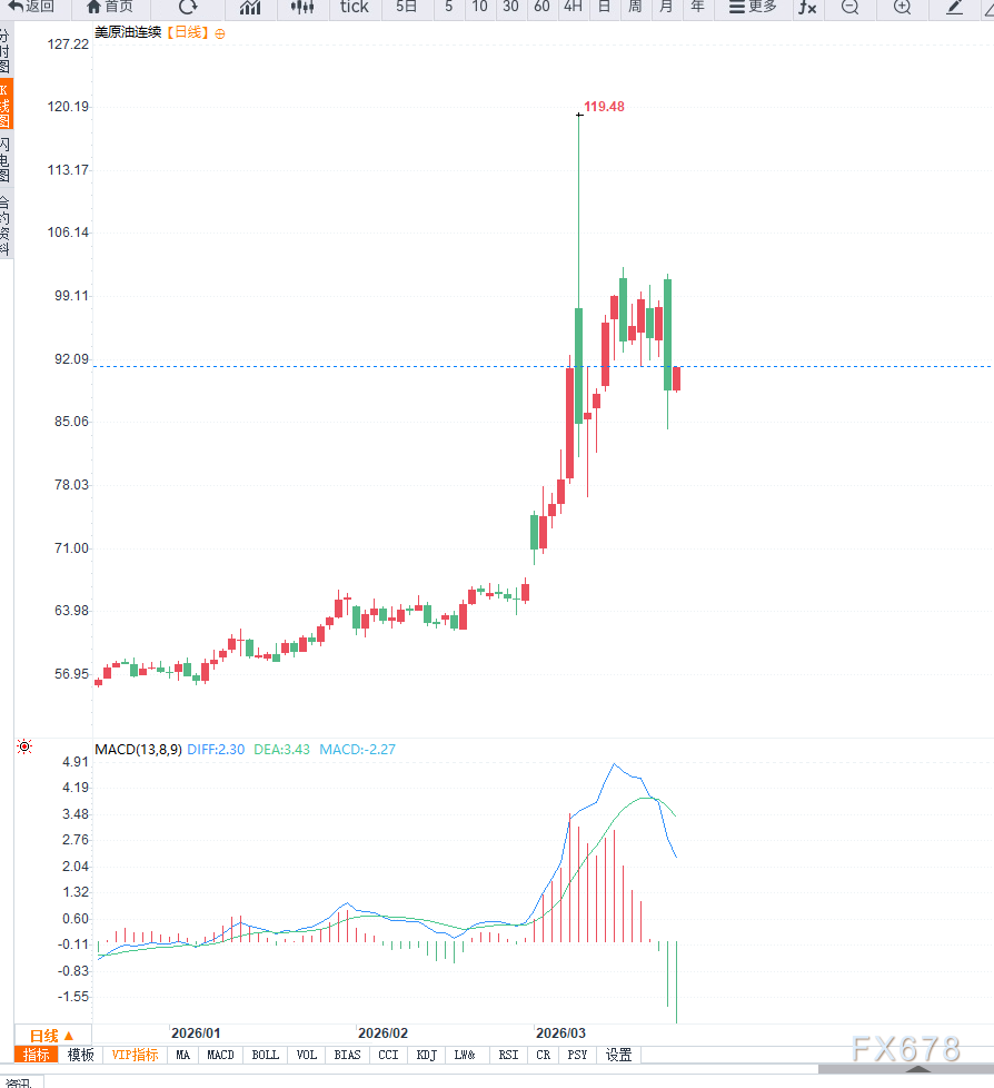 技术面来看,日线结构显示油价在快速冲高后形成阶段性顶部,并在消息冲击下出现放量长阴,短期趋势由强转弱。当前关键支撑位位于85美元附近,若跌破则可能进一步下探至80美元区域;上方阻力则集中在95美元一线,短期内构成明显压制。从动能指标来看,日线级别RSI已从超买区域快速回落,表明多头动能显著减弱。