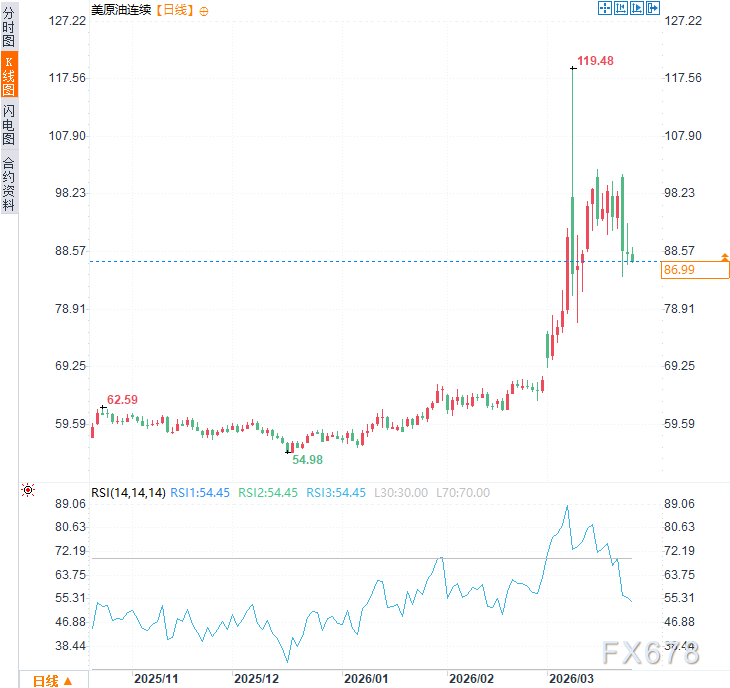 周三亚市时段,美原油价格因对美伊谈判的预期有所回落,但仍处于相对高位,现交投于每桶87.70美元附近,日内跌幅约5%。
