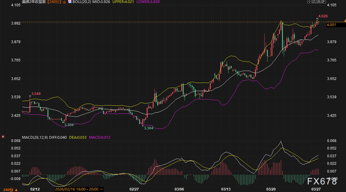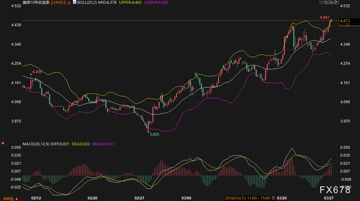 周五(3月27日)机构数据显示,美债市场今日遭遇显著抛售,收益率全线冲高至去年7月以来高位。受中东局势升级及能源价格飙升引发的通胀担忧驱动,2年期与10年期美债收益率双双突破关键阻力位。尽管相关债务减压期限得到延长,但未能缓解市场对全球通胀螺旋的恐惧,债市空头动能持续释放。