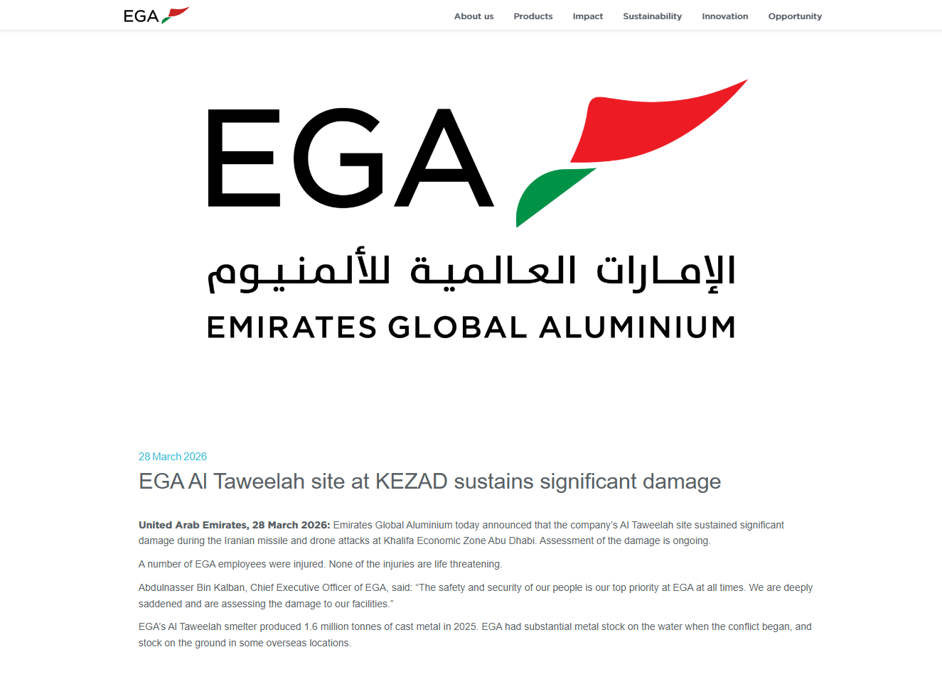 北京时间周六深夜,中东最大的铝生产商阿联酋环球铝业(EGA)发布公告称,当天早些时候,其位于阿布扎比哈利法经济区的塔维拉生产基地遭到伊朗导弹和无人机袭击,并遭受严重破坏。