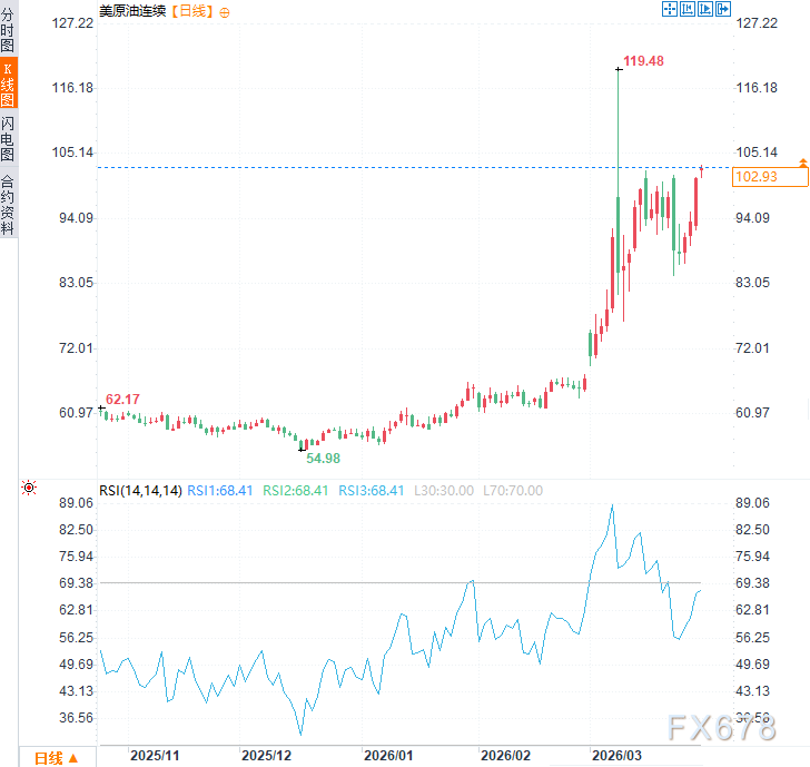 周一(3月30日)亚市时段,伊朗战争持续,美原油价格震荡上行,现交投于每桶103美元附近,对比前一交易日结算价,日内涨幅约3.3%。