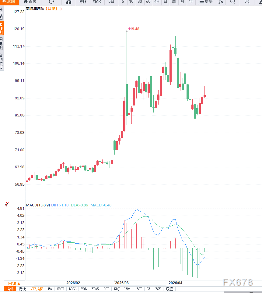从技术面来看,日线级别WTI已突破此前震荡区间上沿,整体结构转为偏多运行,但上涨动能开始边际减弱。目前价格在95至96美元区域面临明显阻力,若有效突破,将有望测试100美元关口;而下方90至92美元构成关键支撑区间,一旦跌破,可能引发更深调整。动能指标显示多头仍占主导,但进入高位整理阶段。4小时周期上,价格在冲高后形成回落结构,短期均线趋于走平,显示多空分歧加大,若无法重新站稳94美元上方,短线或继续震荡整理;但只要维持在90美元上方,整体趋势仍偏向上行。