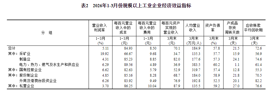 3月末,规模以上工业企业每百元资产实现的营业收入为70.1元,同比减少0.2元;人均营业收入为184.9万元,同比增加10.5万元;产成品存货周转天数为21.5天,同比增加0.3天;应收账款平均回收期为72.6天,同比增加1.3天。