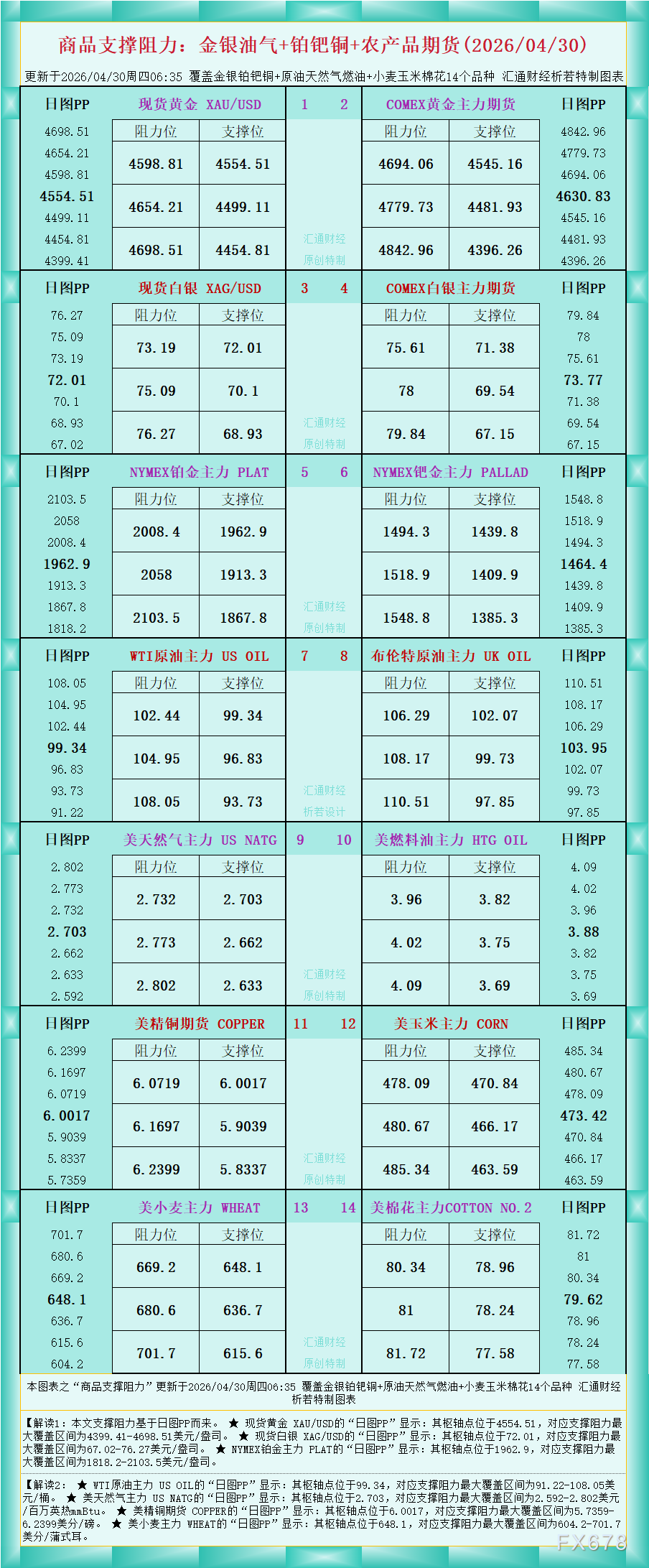一张图看商品支撑阻力:金银油气+铂钯铜+农产品期货,更新于2026年4月30日周四06:35,具体覆盖金银铂钯铜+原油天然气燃油+小麦玉米棉花14个品种,更多详见汇通财经析若特制图表中的内容。