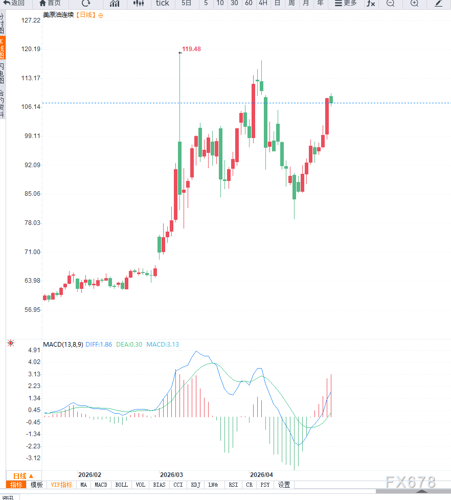 从技术面来看,WTI日线级别呈现明显上行趋势,价格已突破前期关键阻力区域约100美元关口,并站稳在105美元上方,显示多头动能持续增强。短期内上方阻力可关注112美元附近区域,而下方支撑位则位于100美元及96美元区间。动能指标方面,相对强弱指数(RSI)维持在高位区间,显示市场存在一定超买迹象,但尚未出现明显顶部信号。4小时周期来看,油价维持震荡上行结构,短期均线呈多头排列,若价格回踩102美元附近并获得支撑,则有望继续上探前高;但若跌破100美元关口,则可能触发技术性回调。
